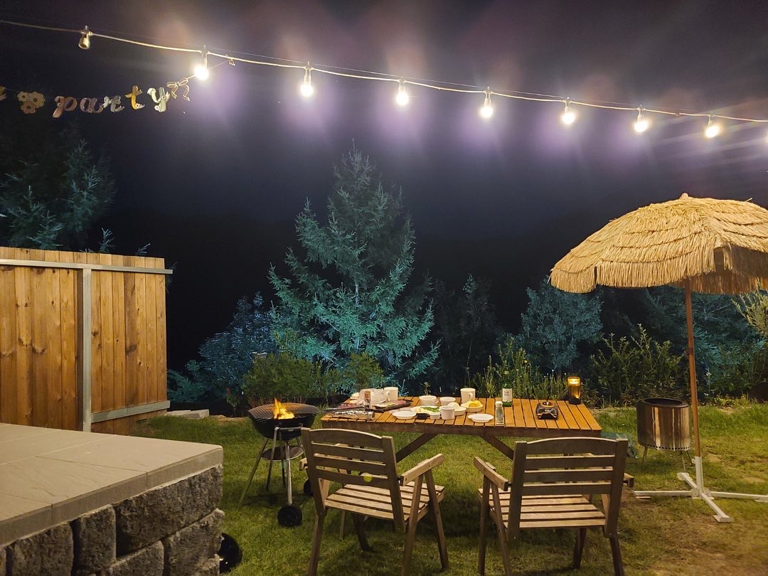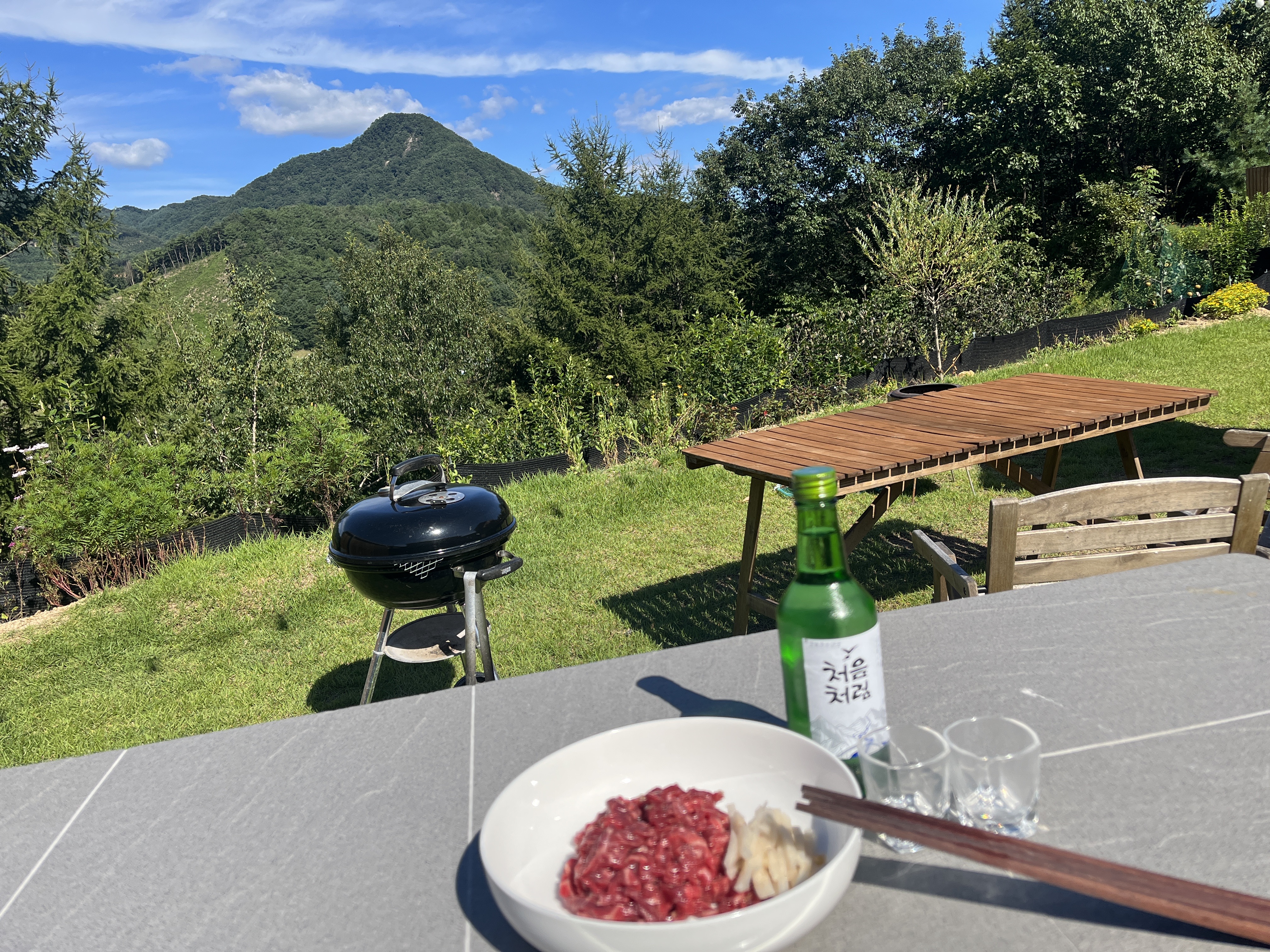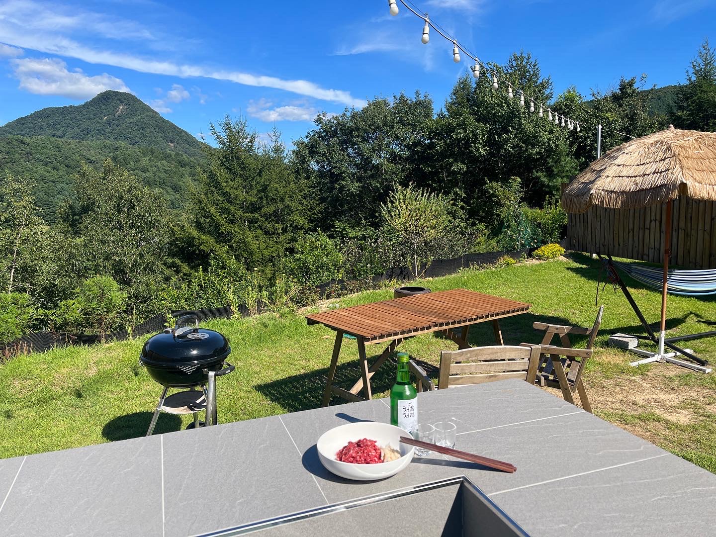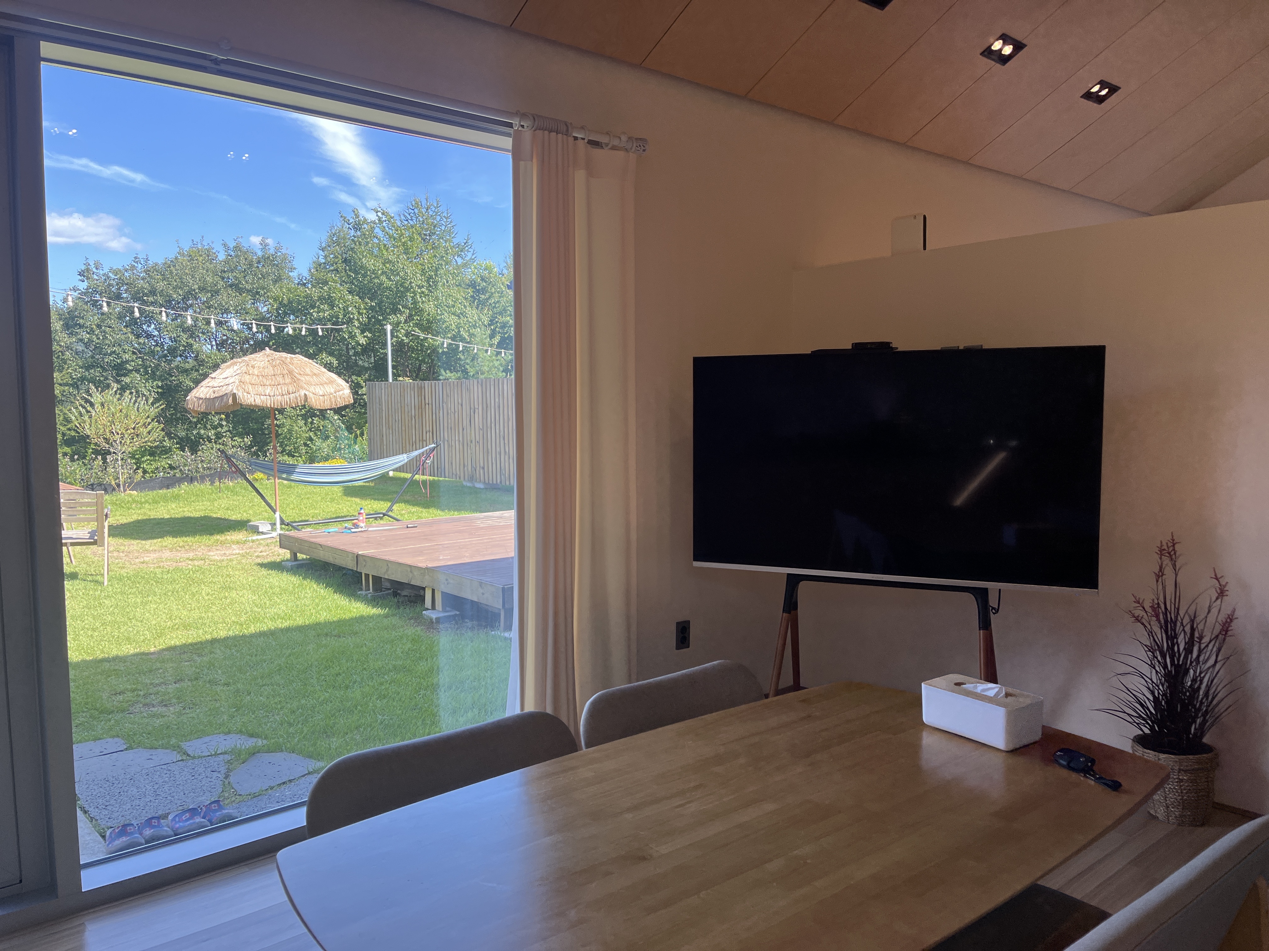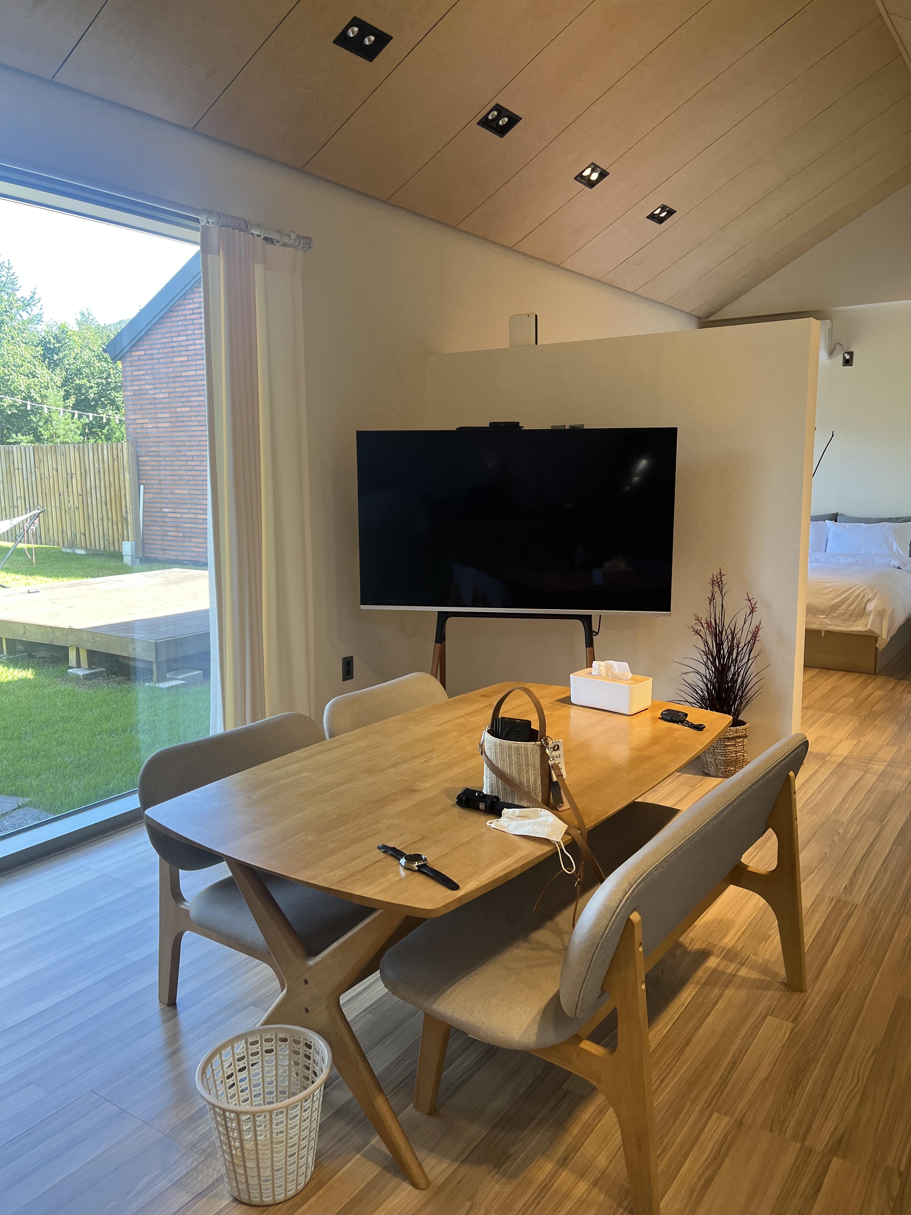 부엌과 티비가 있는 거실에서 보이는 큰 통창은 마치 계절과 자연을 온전히 보여주는 액자역할을 했다. 낮에는 창을 바라보며 여유를 즐겨도 시간이 금방가는 듯 했다. 각 방마다 프라이빗하게 이용할 수 있는 앞 정원에는 바베큐를 이용할 수 있는 시설이 구비되어있었다.