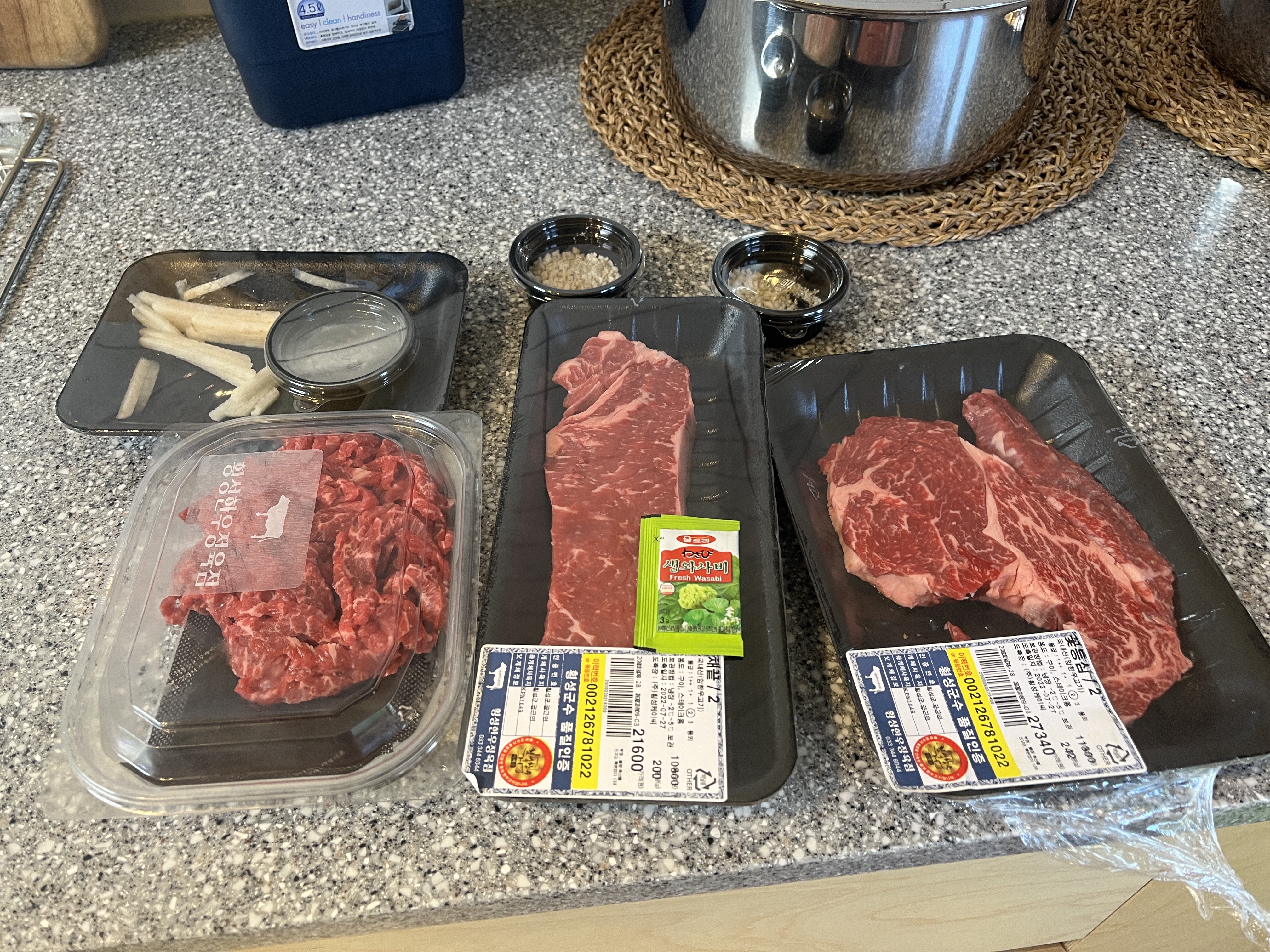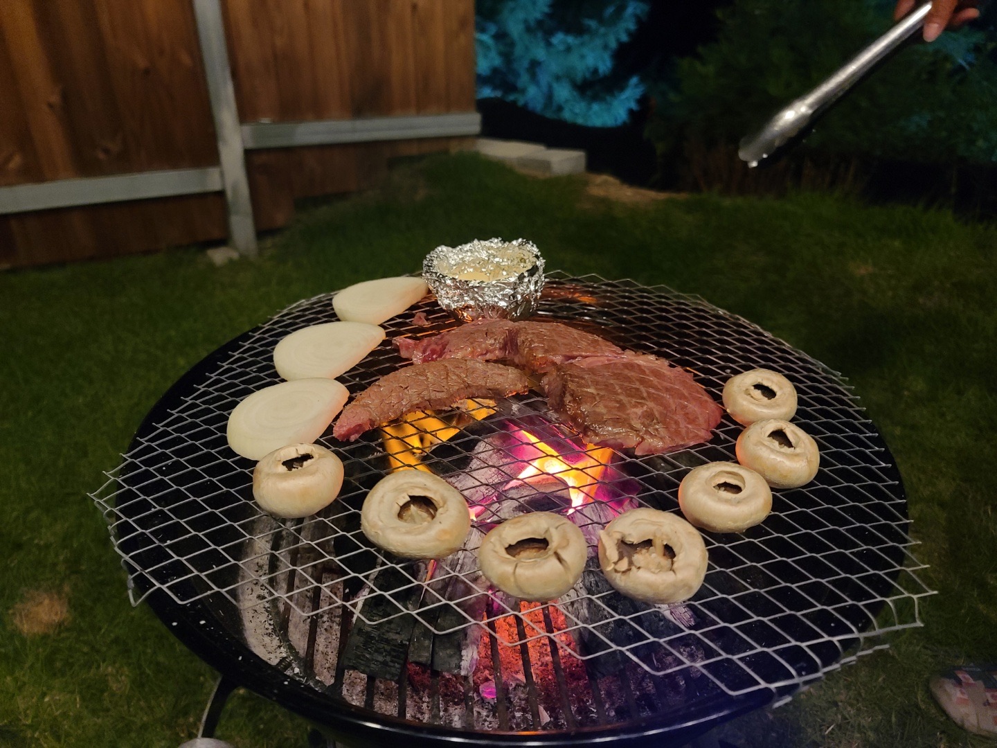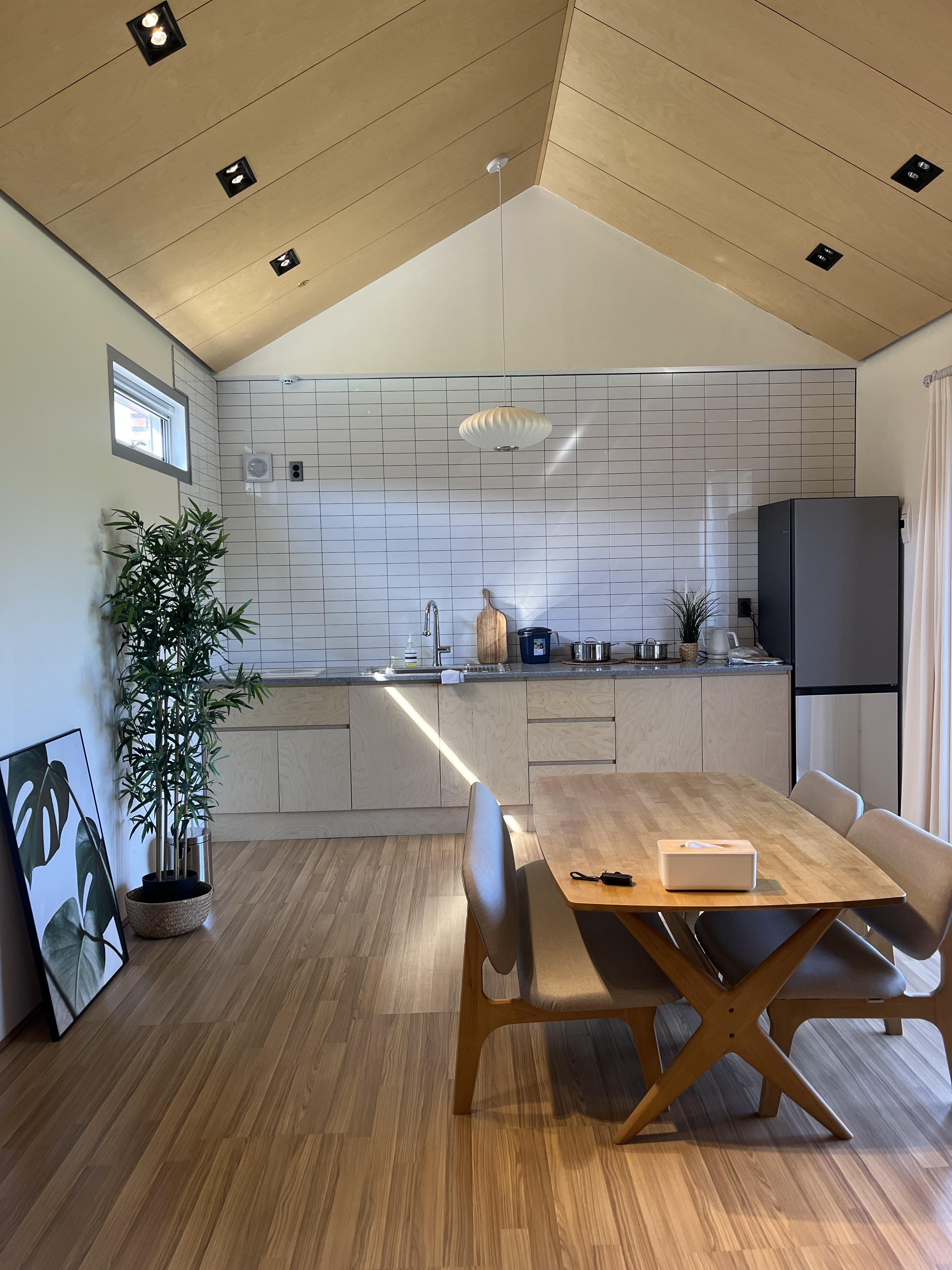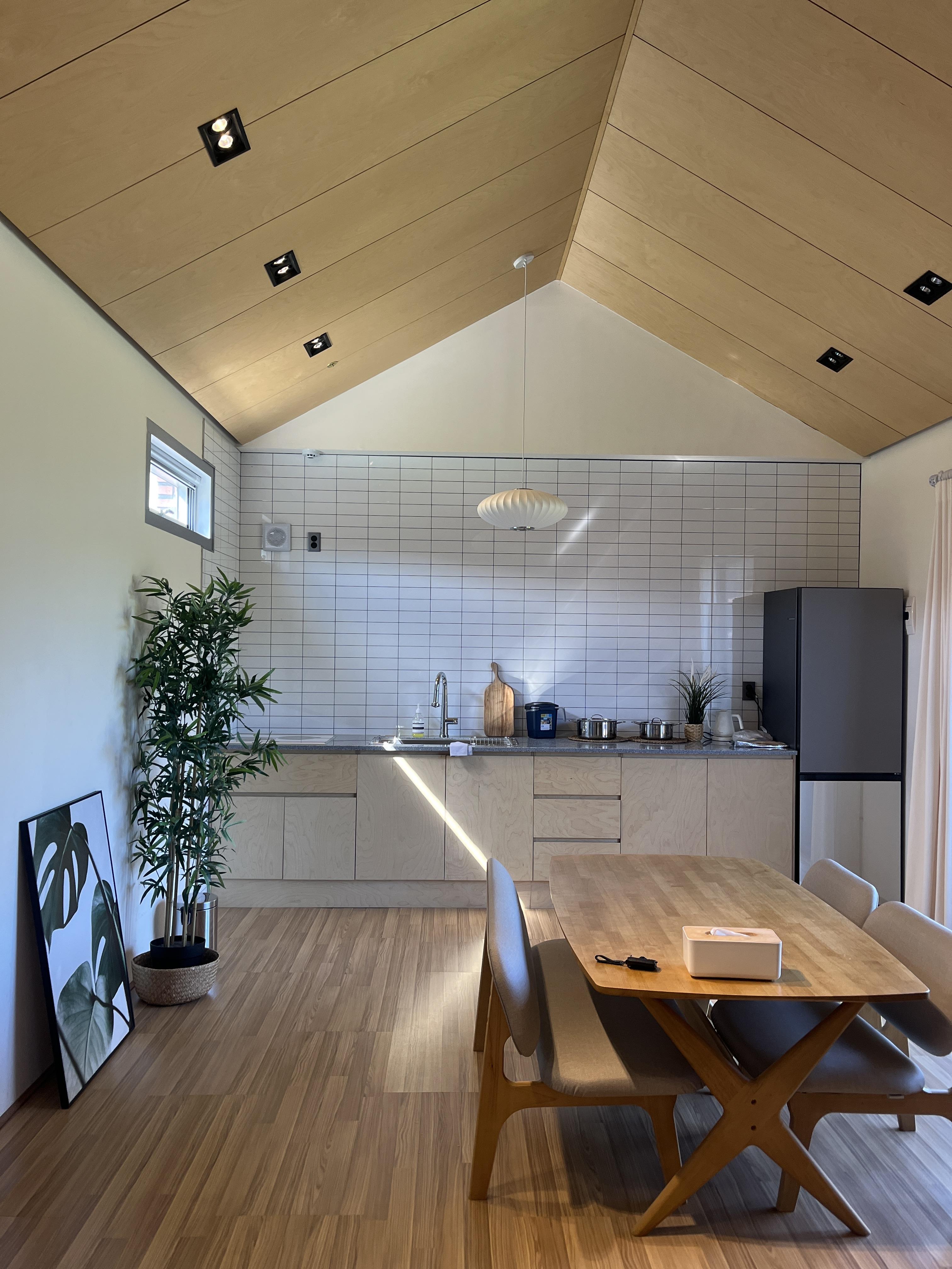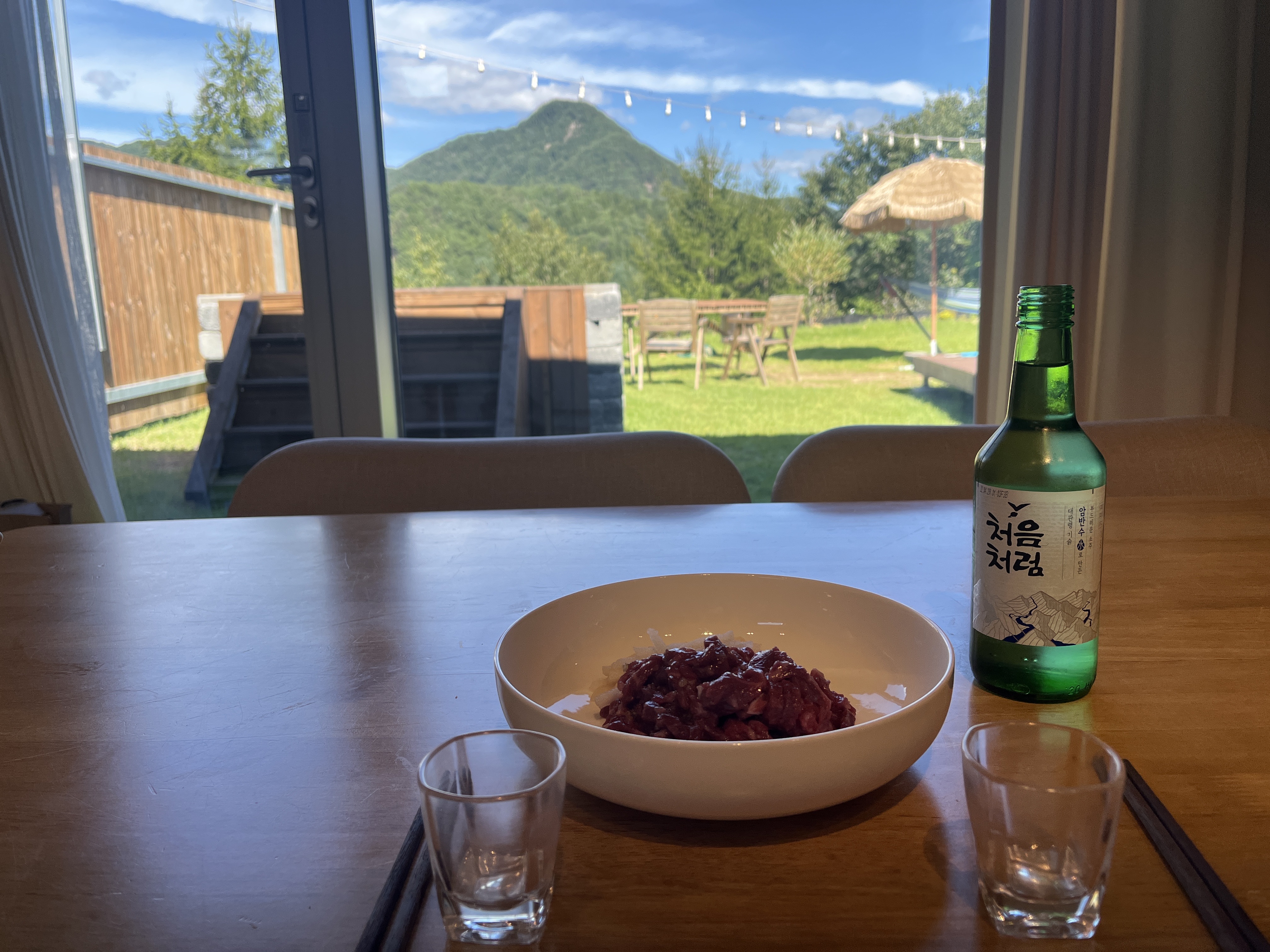 부엌과 티비가 있는 거실에서 보이는 큰 통창은 마치 계절과 자연을 온전히 보여주는 액자역할을 했다. 낮에는 창을 바라보며 여유를 즐겨도 시간이 금방가는 듯 했다. 각 방마다 프라이빗하게 이용할 수 있는 앞 정원에는 바베큐를 이용할 수 있는 시설이 구비되어있었다.